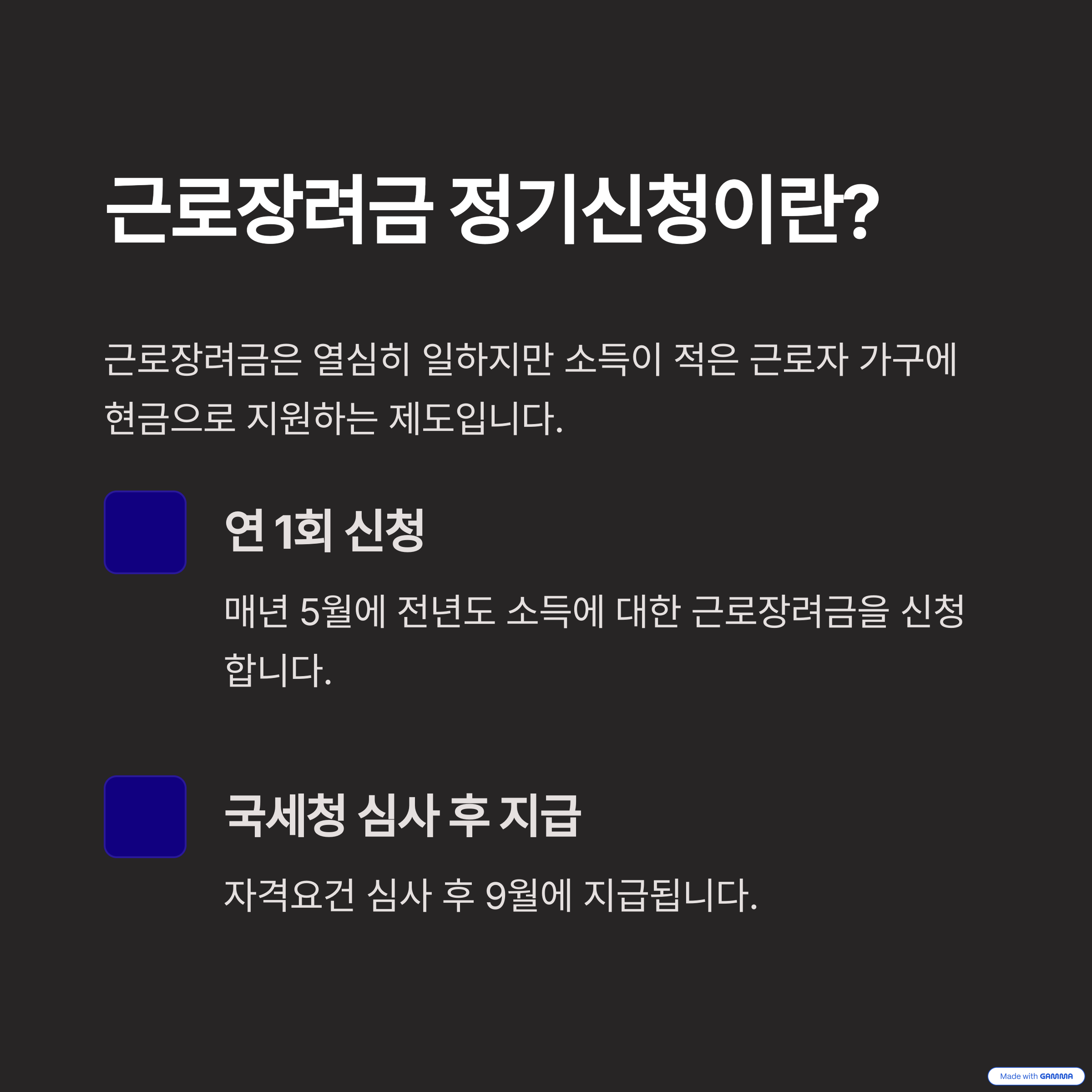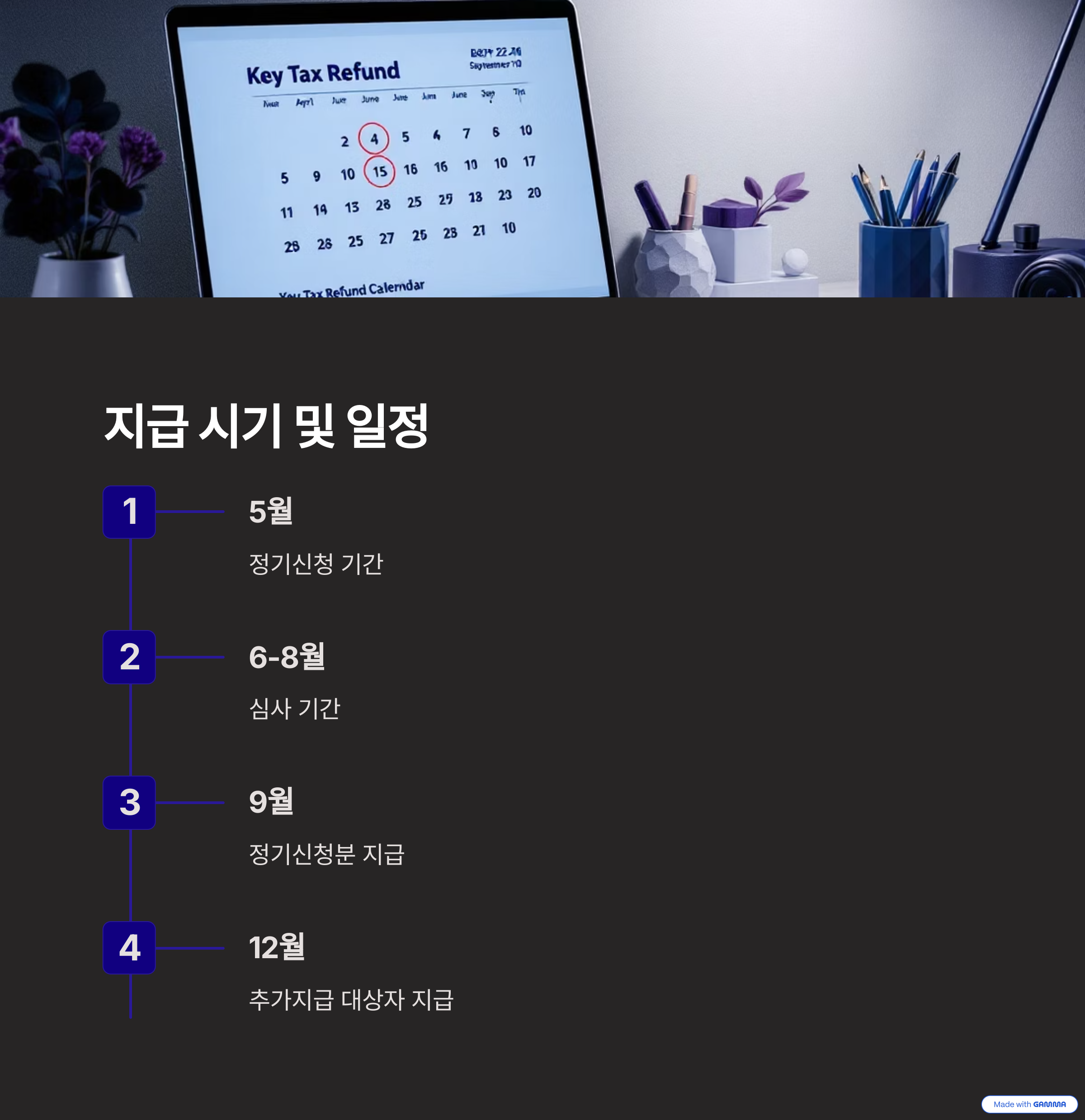 1. 매년 5~6월에 정기 접수, 국세청 홈택스 또는 세무서 통해 신청 2. 심사 완료 후 9~10월에 지급 시작, 계좌 오류나 지연 시 홈택스 확인과 콜센터 상담 권장 신청 자격 및 준비서류 1. 소득·재산 기준 충족 필요, 신분증·소득증명원·재산세증명서 등 준비 2. 온라인 또는 세무서 방문으로 쉽게 제출 가능 정기신청 절차 및 방법 1. 홈택스 웹 또는 모바일 앱으로 신청 2. 세무서 방문 신청 가능, 서류 작성 도움 받기 유리 지급 시기 및 일정 1. 2025년 기준 5/1~6/1 신청, 심사 후 9~10월 중 첫 지급 2. 정확한 지급 시점은 문자 알림 및 홈택스 ‘지급내역’ 확인 필수 사례로 보는 신청 후 과정 1. 5월 신청 → 7월 심사 완료 안내 → 9월 말 첫 지급 2. 계좌 오류 시 홈택스에서 수정, 경정청구 시 추가지급 가능 자주 묻는 질문 (FAQ) 1. 신청 기간 지날 시 반기 신청이나 내년 정기 신청으로 대체 2. 지급 지연 시 홈택스 또는 콜센터에 문의 3. 서류 누락 시 보완 요청, 기간 내 제출하면 처리