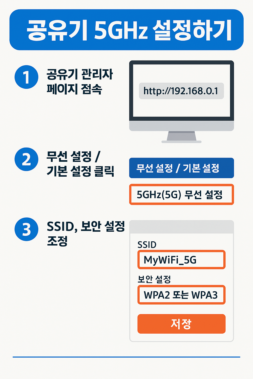 - SSID(와이파이 이름): 이름 뒤에 5G 또는 5 GHz 붙이기
